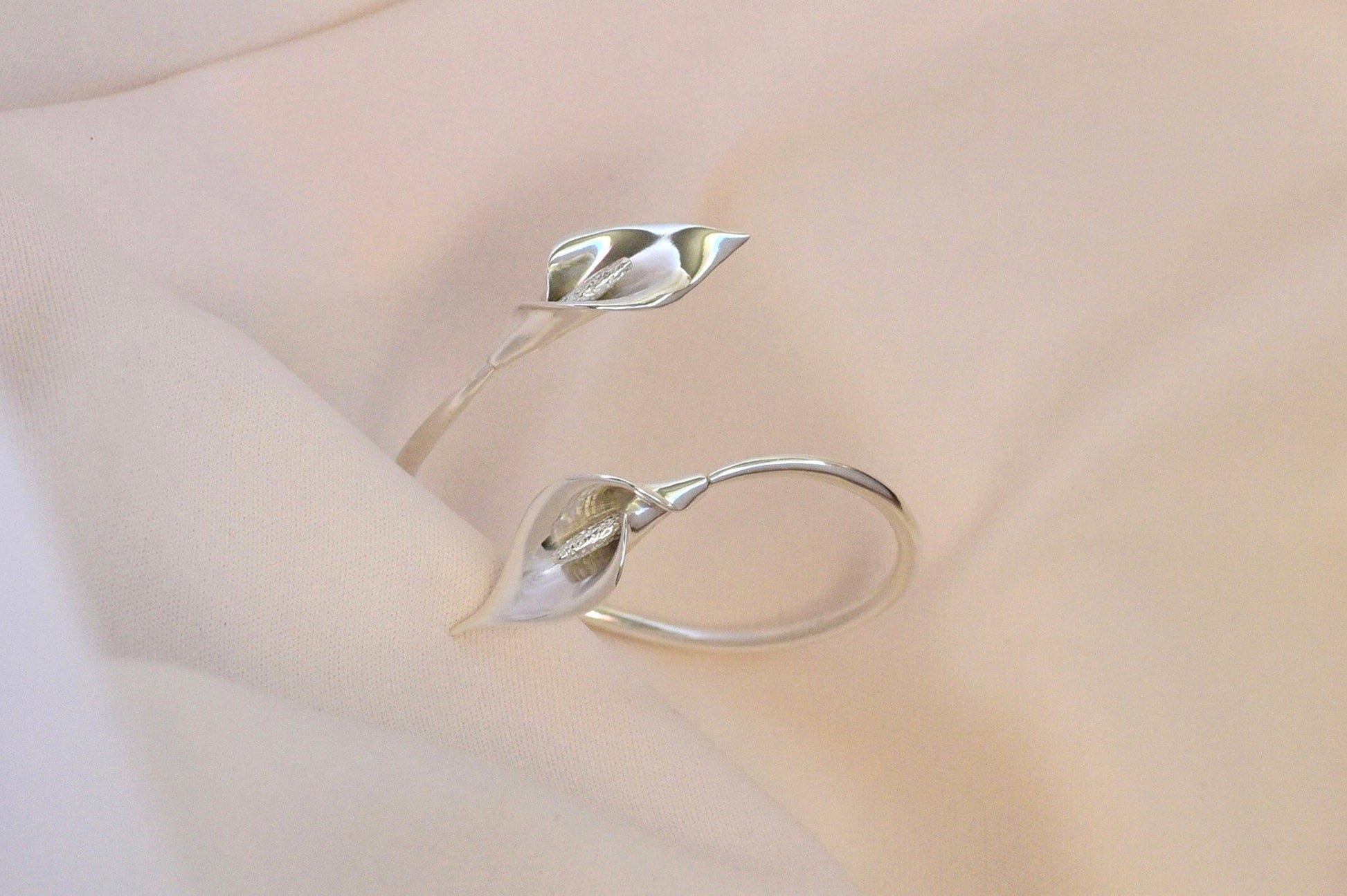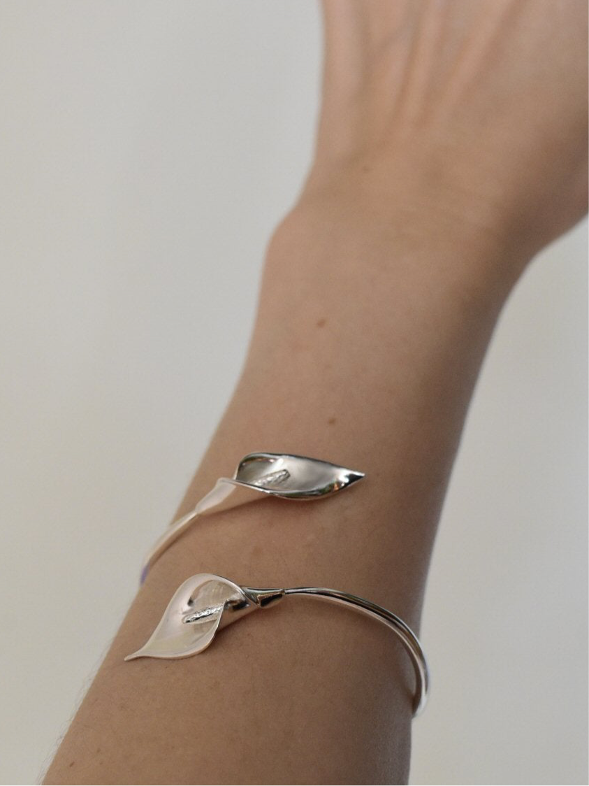 Sculptural calla lily bracelet, hand made in sterling silver.